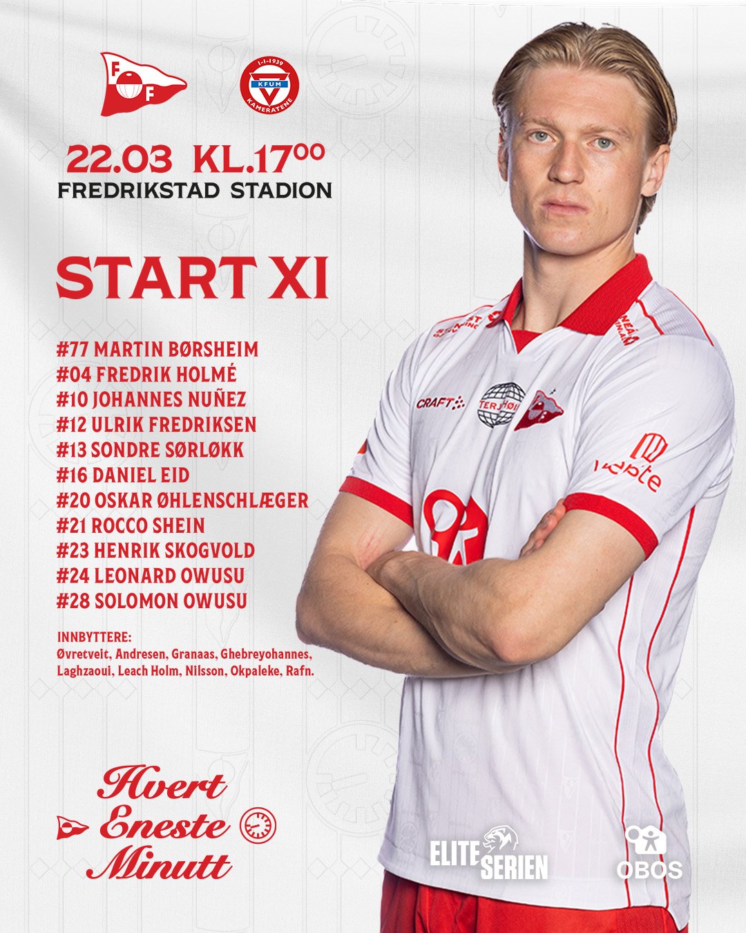 Årets første Eliteseriekamp på Fredrikstad Stadion nærmer seg med stormskritt. Vi er i skrivende stund kun fem kvarter unna avspark mot KFUM – og med det er hvem som starter hjemmepremieren nå offentliggjort.