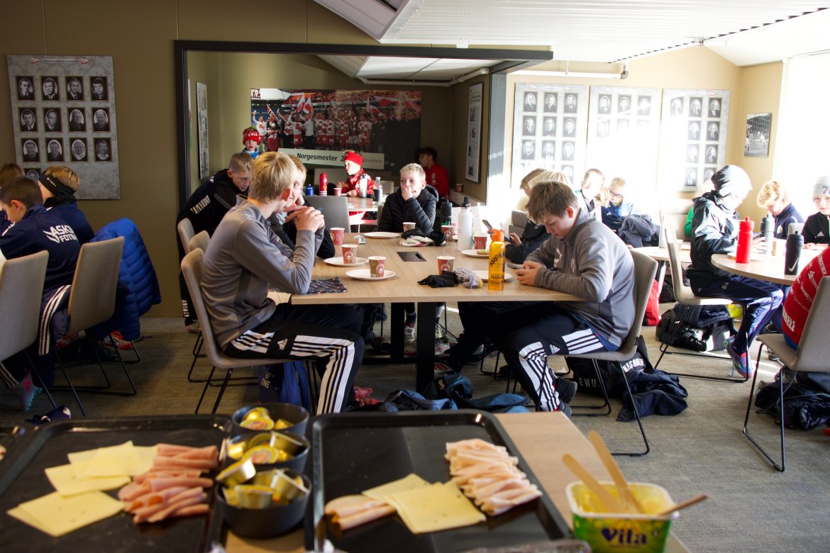 Etter treningsøkten samlet gruppen seg i klubbrommet for lunsj, samtidig som de fikk observere A-lagets treningsøkt ute på stadion. Her fikk de mulighet til å se hvordan de profesjonelle jobber i hverdagen.