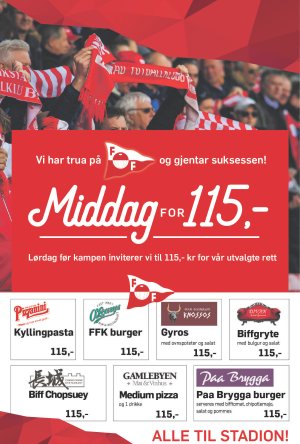 7 av byens restauranter går nå sammen for at ikke FFK-publikummet skal gå sultne på kamp lørdag. For 115 kroner får du kjøpt middag før kampstart i byen.